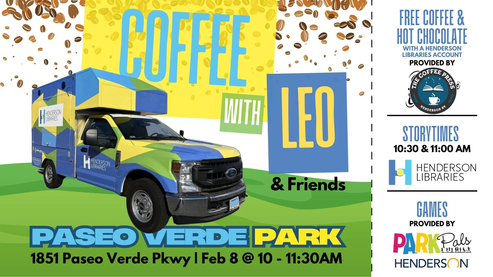 Join Leo (the Henderson Libraries bookmobile) for Storytimes, Games, and Free Coffee/Hot Chocolate (with a library account) provided by The Coffee Press! While supplies last!!