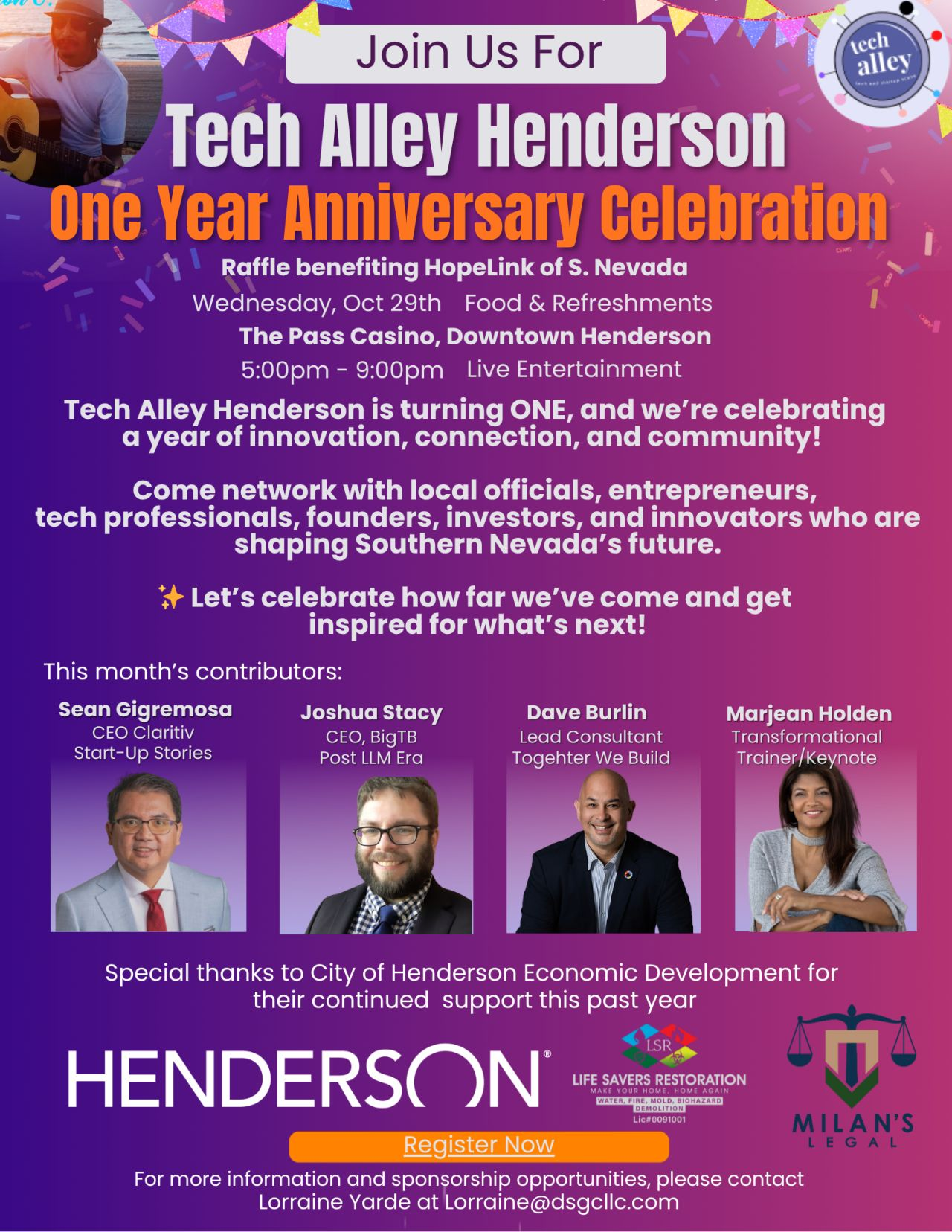 We’re excited to celebrate one incredible year of innovation, collaboration, and community at Tech Alley Henderson’s One-Year Anniversary Celebration – taking place October 29th at The Pass Casino in Downtown Henderson!